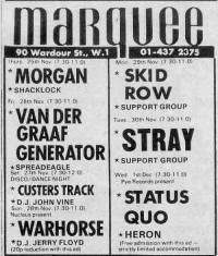 October 9th 1976 – Nick Simper and Roger Truth take part in the “Johnny Kidd Memorial Show” at the Edwardian Club at the Loughborough Hotel in Brixton. Carlo Little guests on drums, along with Screaming Lord Sutch and Wee Willie Harris on vocals.